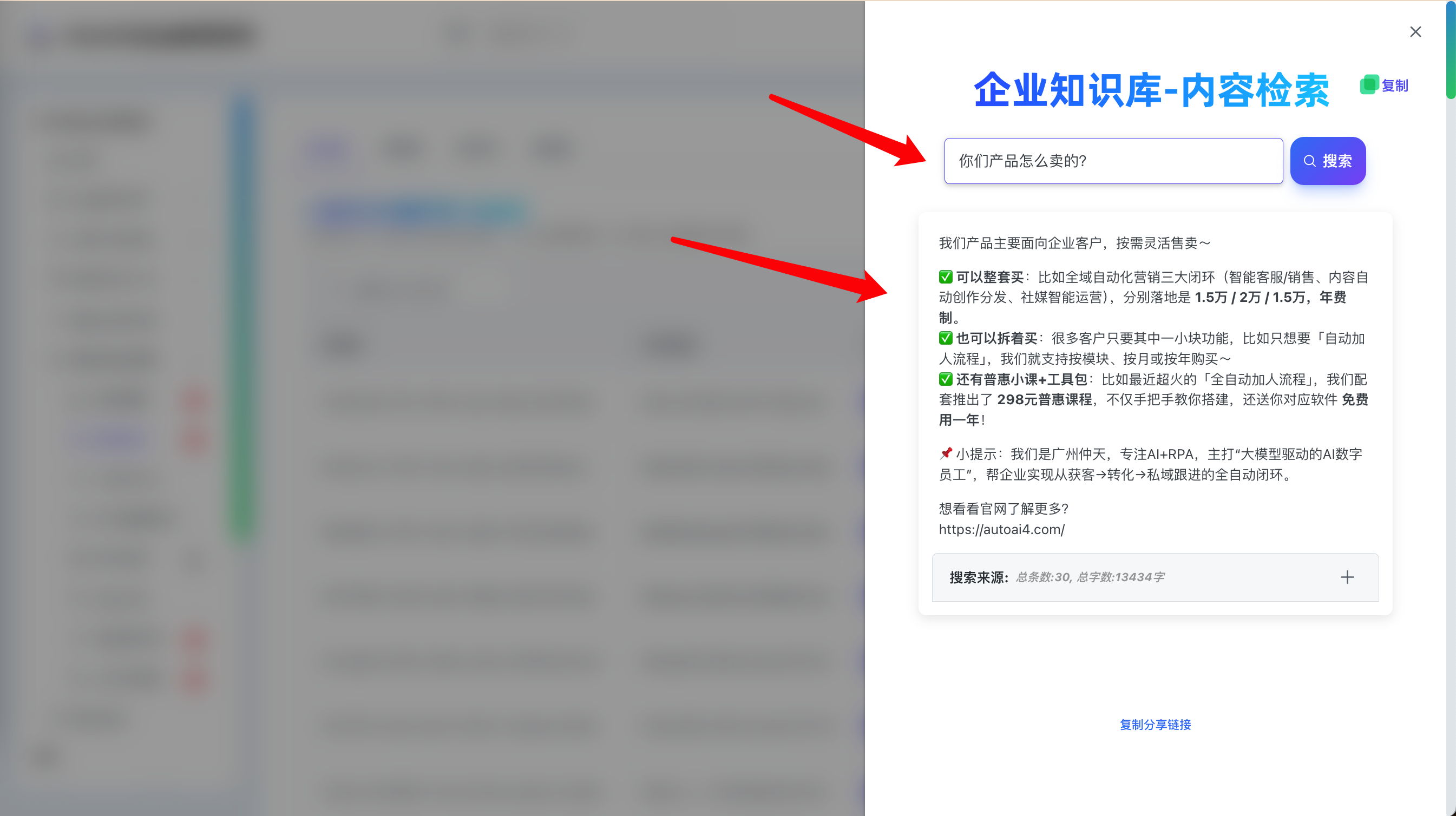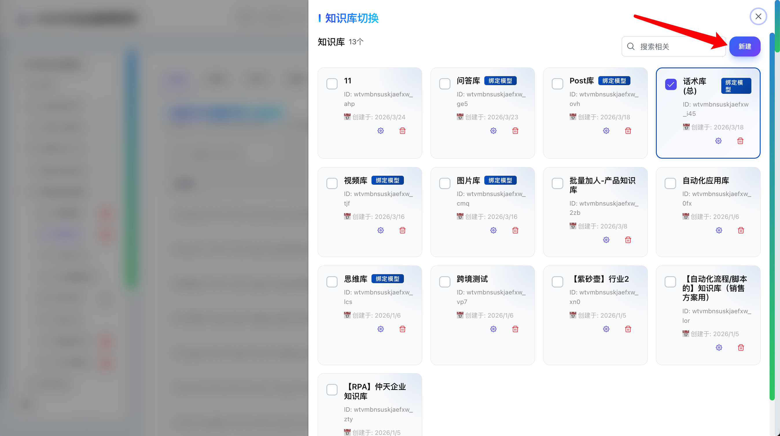 点击切换,可以切换到不同的知识库进行测试。不同的知识库用于在不同场景下使用,比如业务a知识库,业务b知识库。