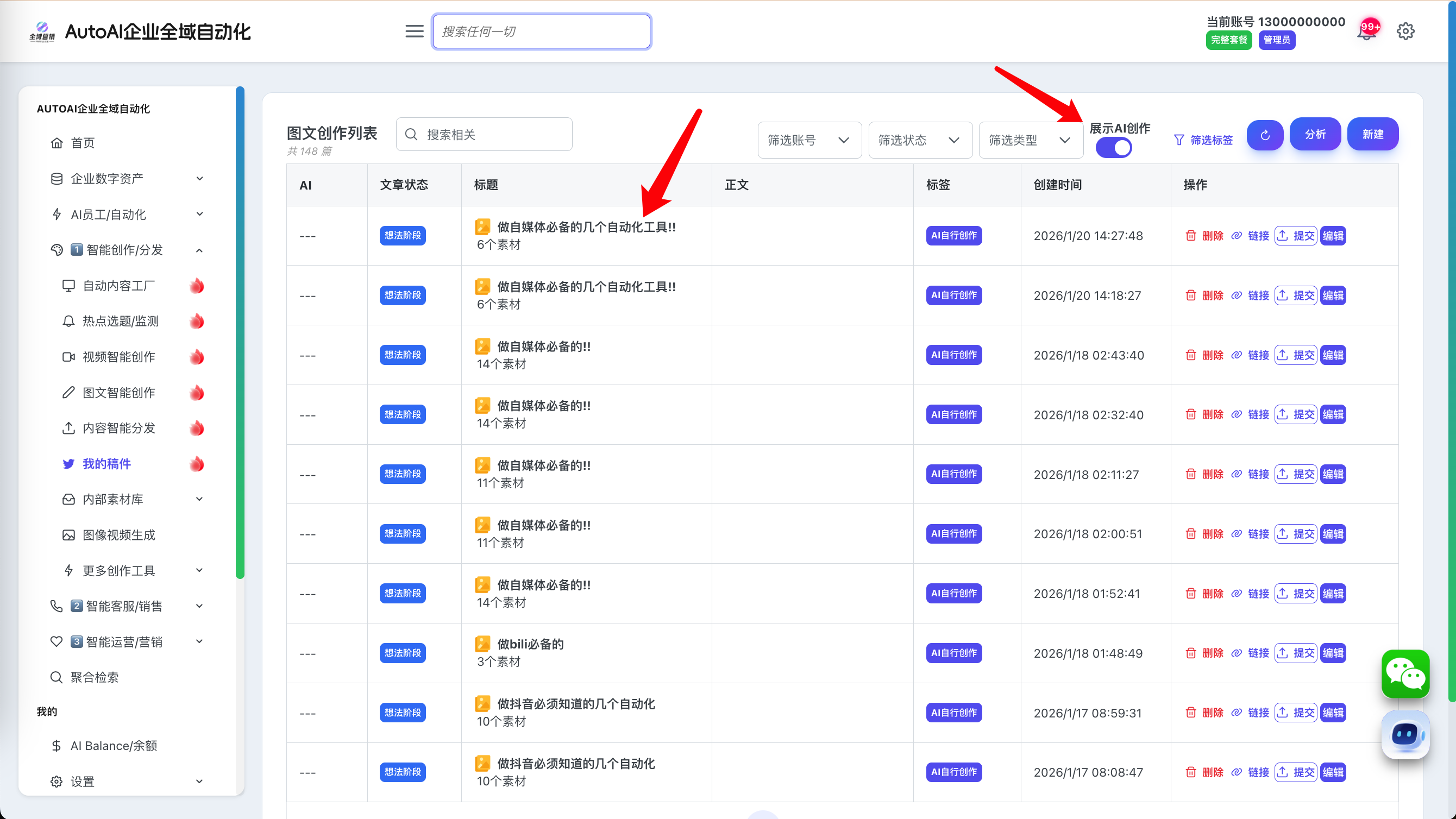今天演示一个 从批量创作、到批量发布的图文案例。 基于企业素材库、知识库,根据不同的账号人设、风格、热点,向外创作出大量图文SEO内容 。可批量输出到知乎、搜狐、等等更多平台。