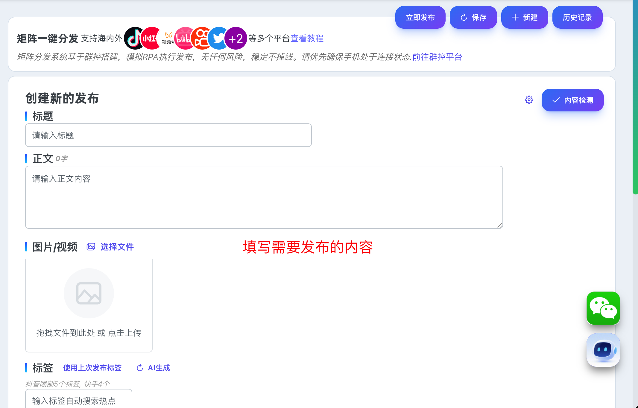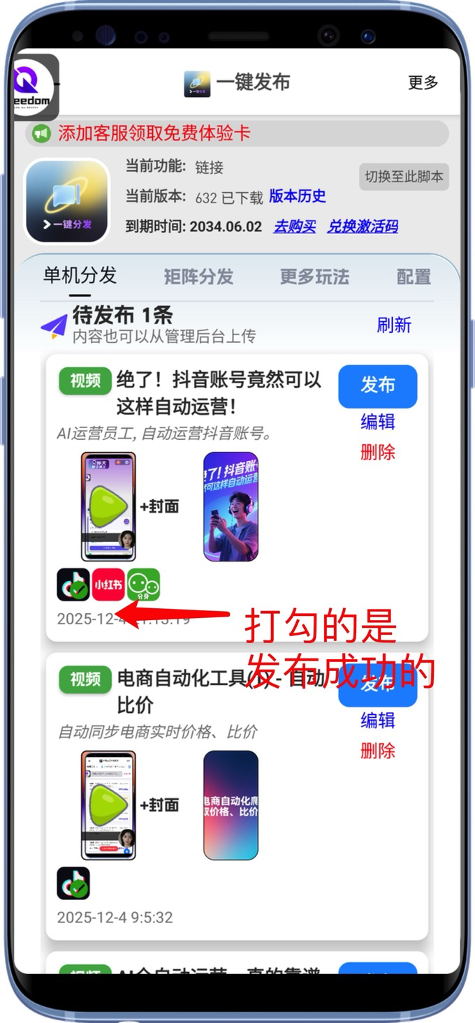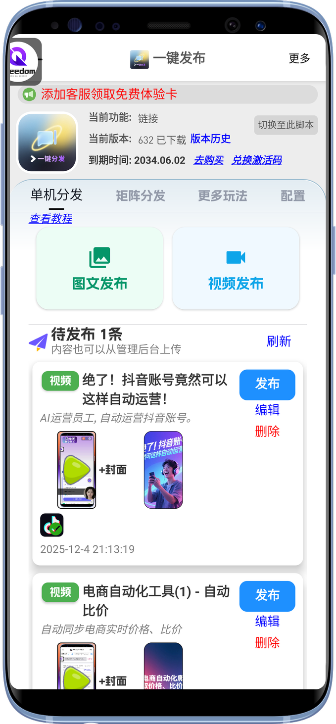 适合操控多台手机发布、手机发布版本见下文 手机端插件升级至最新版本、并且和后台登陆同一个账号
