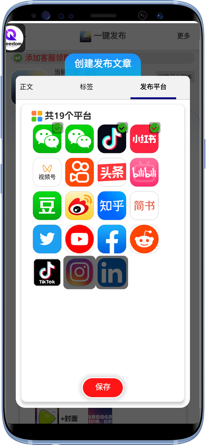 支持海内外10+平台发布, 只需一个App就可帮助您将内容同步到各大平台。