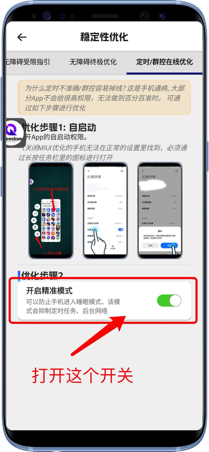 为什么定时不准确? 手机通病, 大部分App不会给很高权限,无法做到百分百准时。可通过如下步骤进行优化