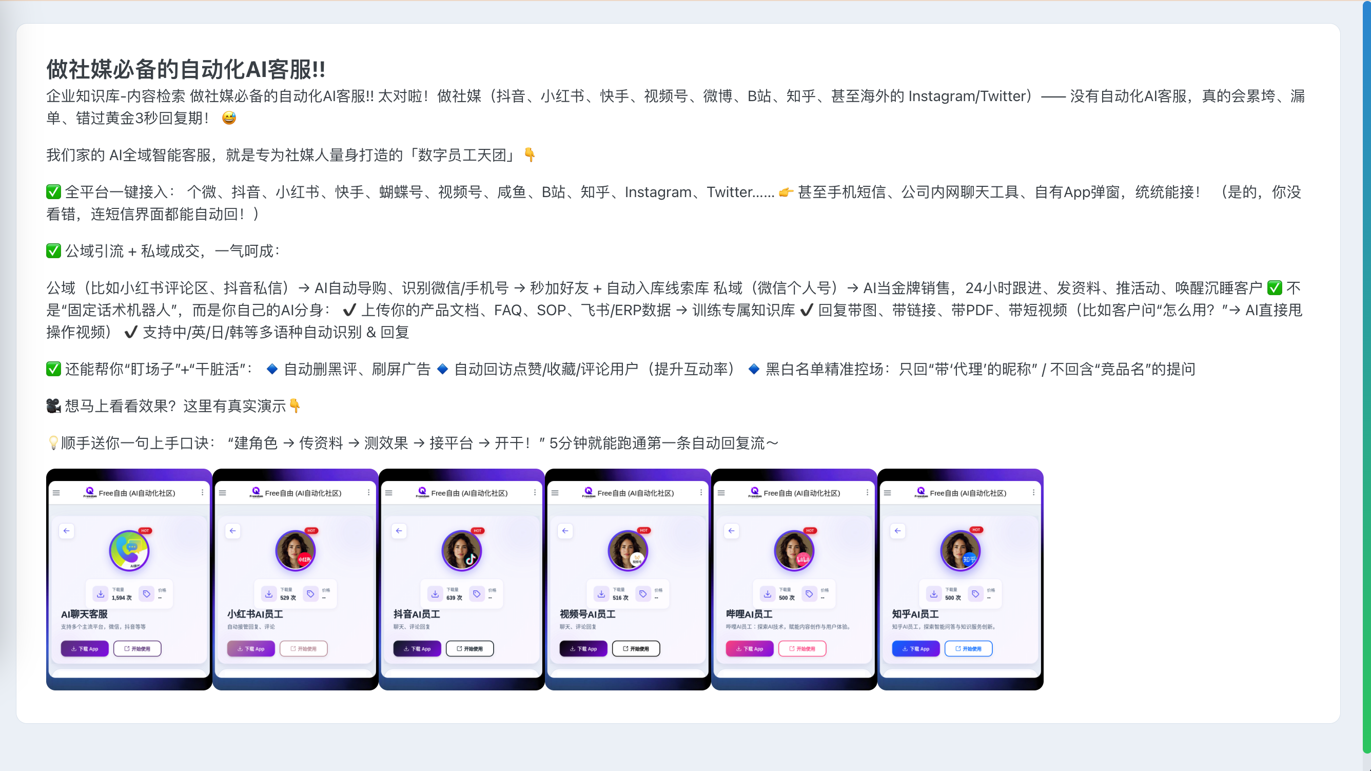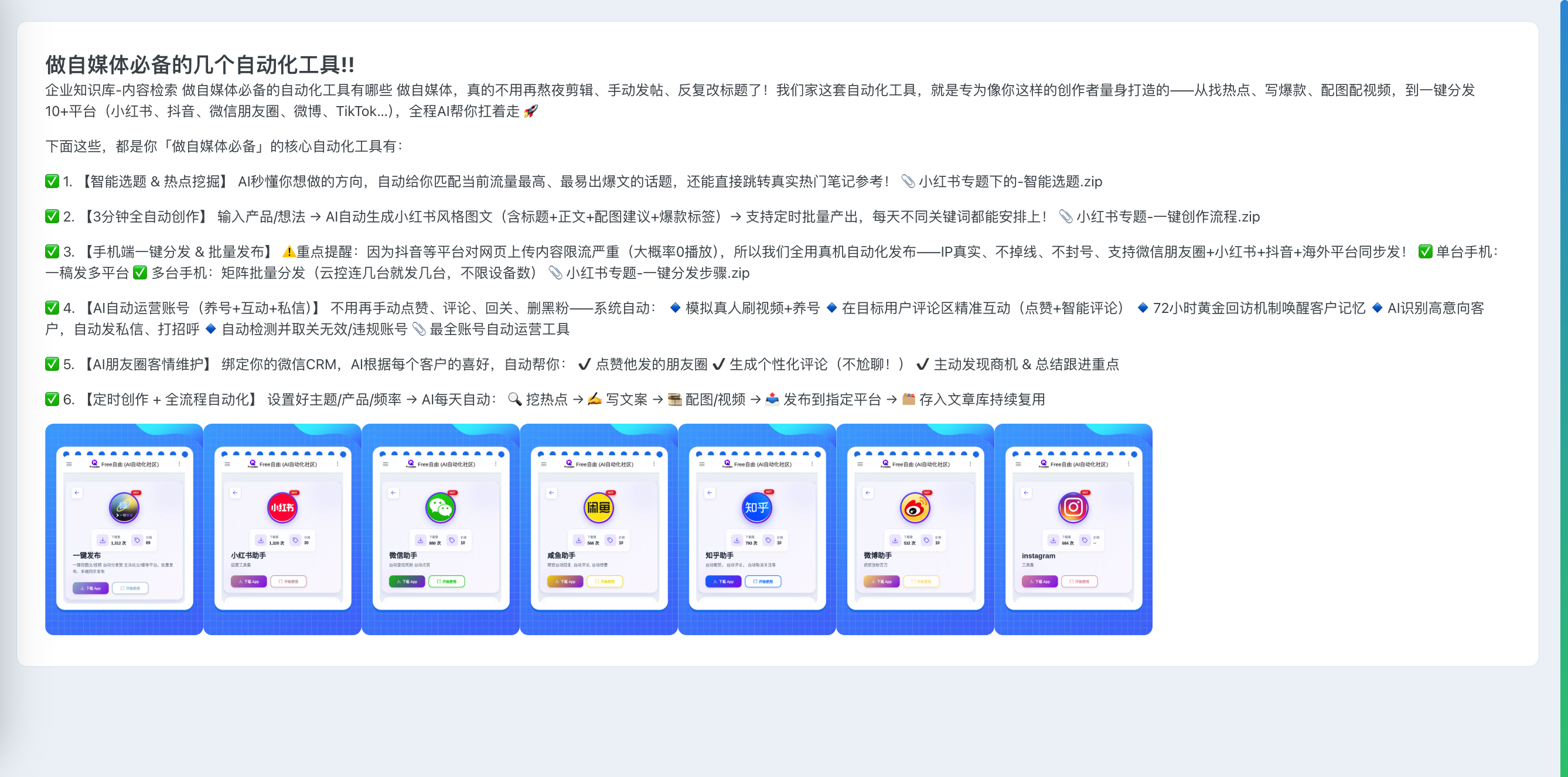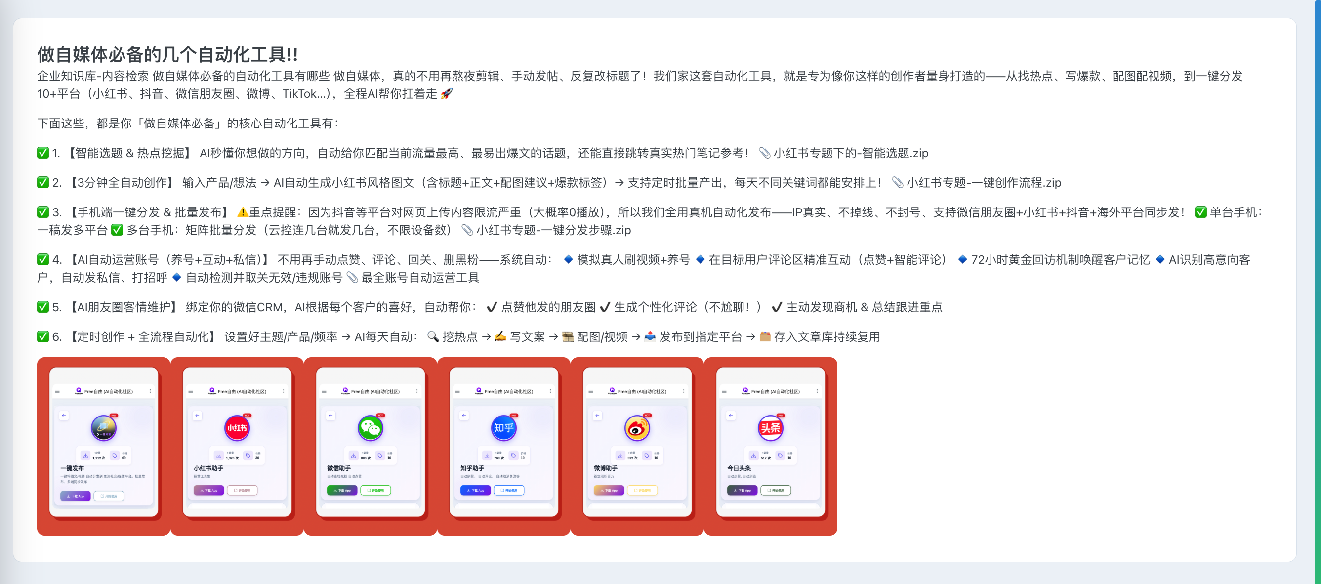 根据一句话,自动整理创作素材、创作思路、创作风格、匹配的创作热点、以及当前平台上和内容相关的高热点。最后生成可供实际使用的多篇图文。 区别于大模型直接生成的文章,智能创作通过大量素材、企业知识库材料的辅正、风格的控制、以及等等变量因素、来把控生成文章的质量