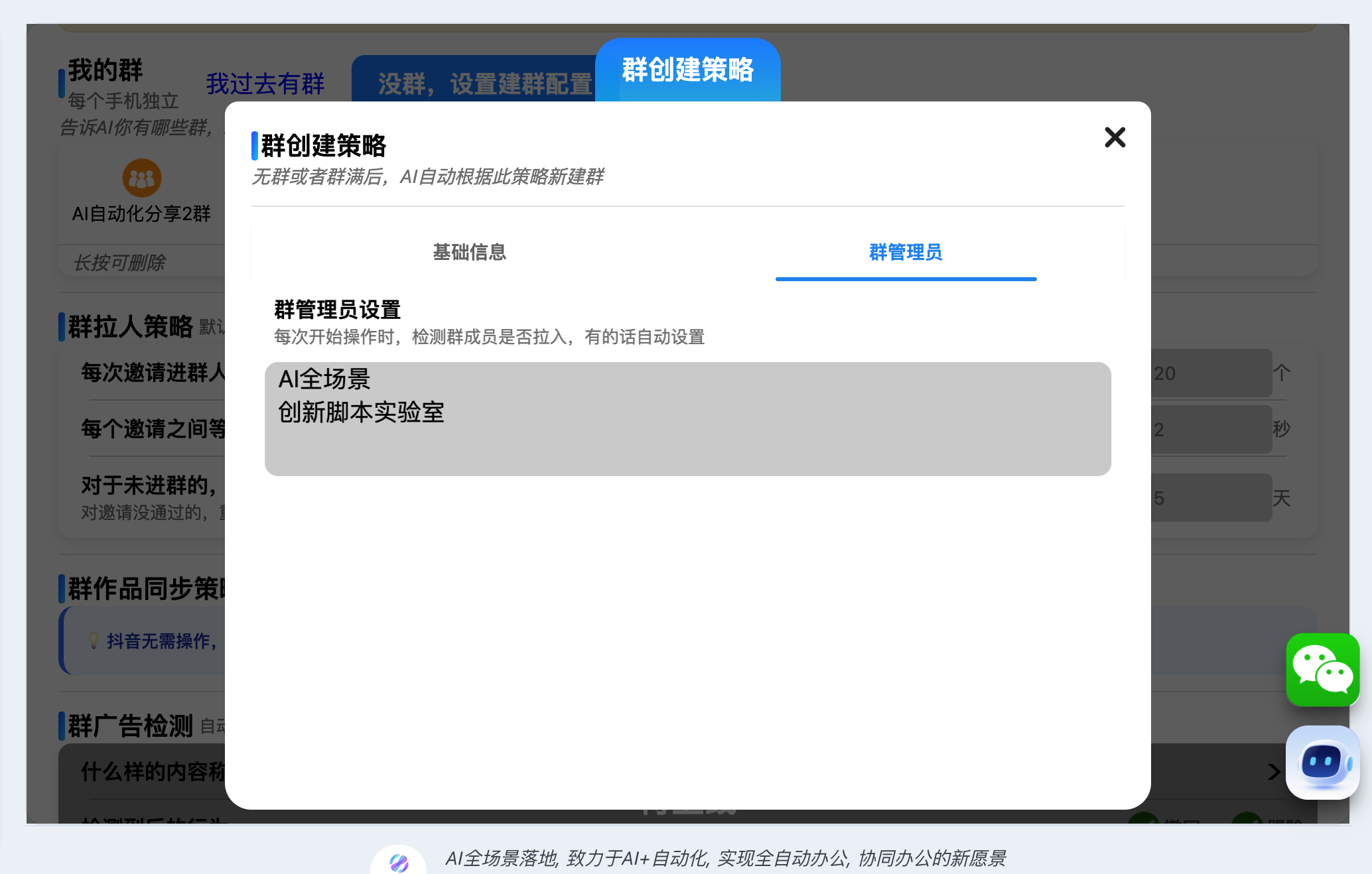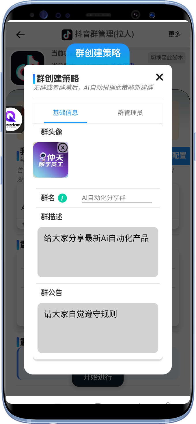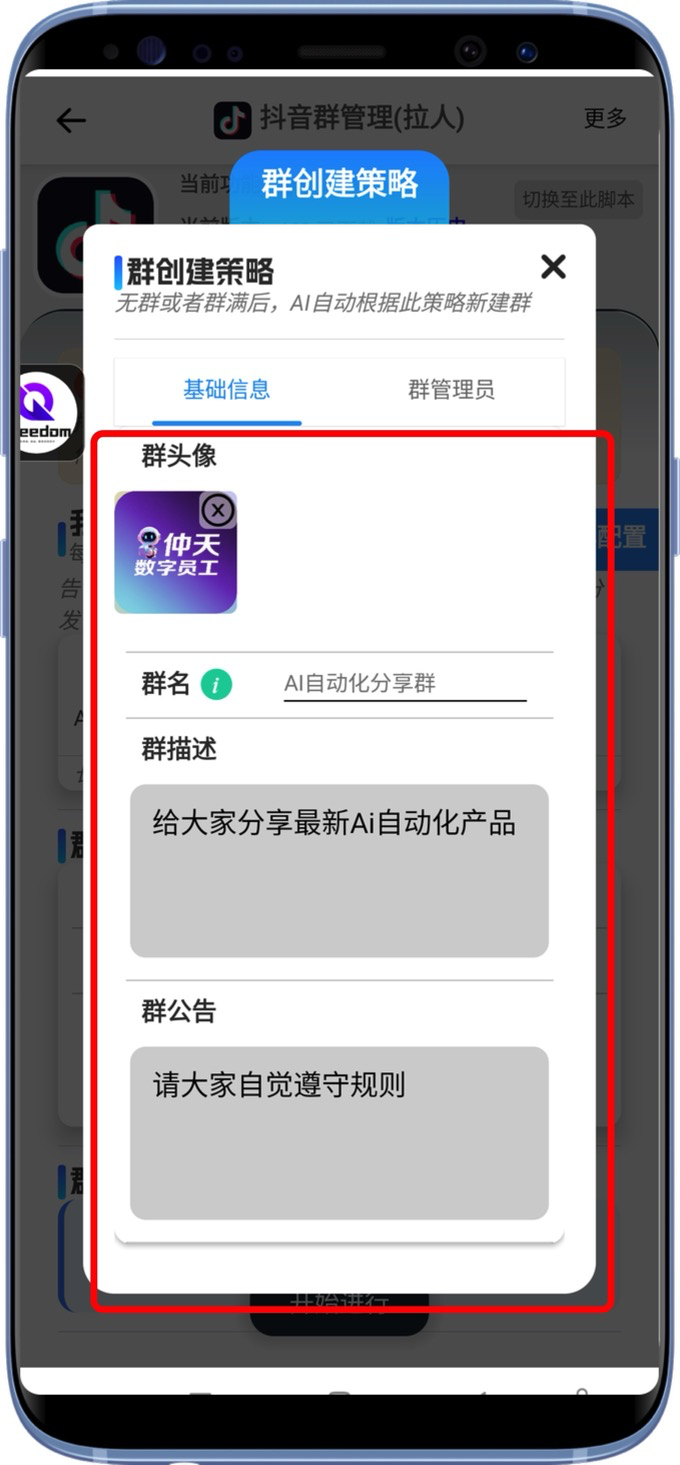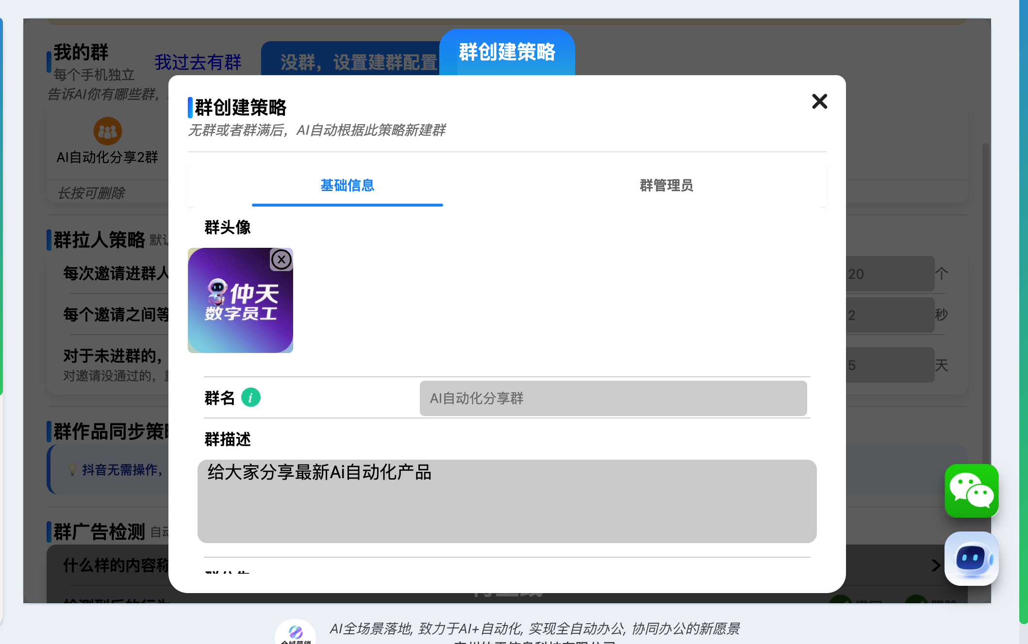 让AI知道你的建群策略。设置群名、群描述、群公告、群头像。以及群管理员