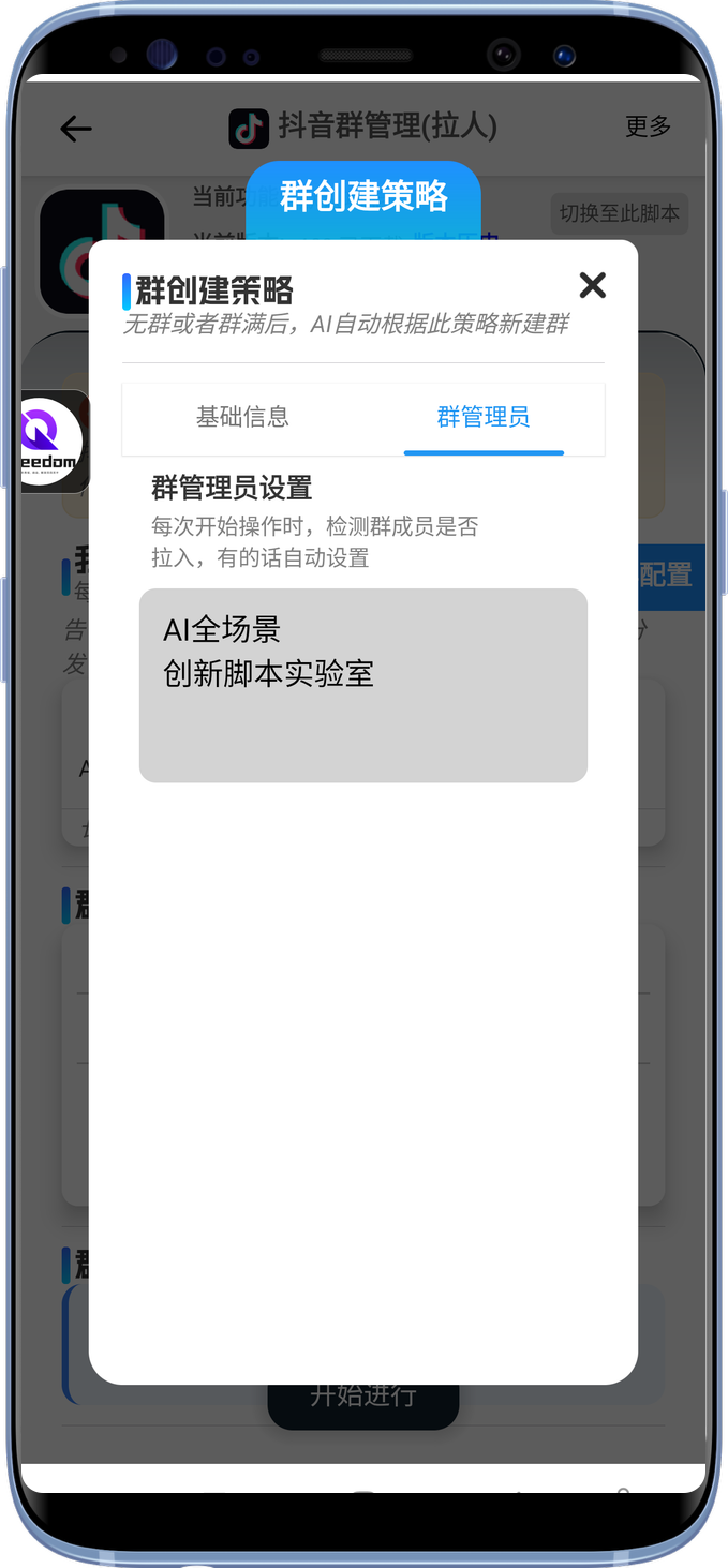 - 自动添加管理员。设置在建群策略中,设置好管理员名字,每次操作结束时,会自动进行一轮管理员设置添加。