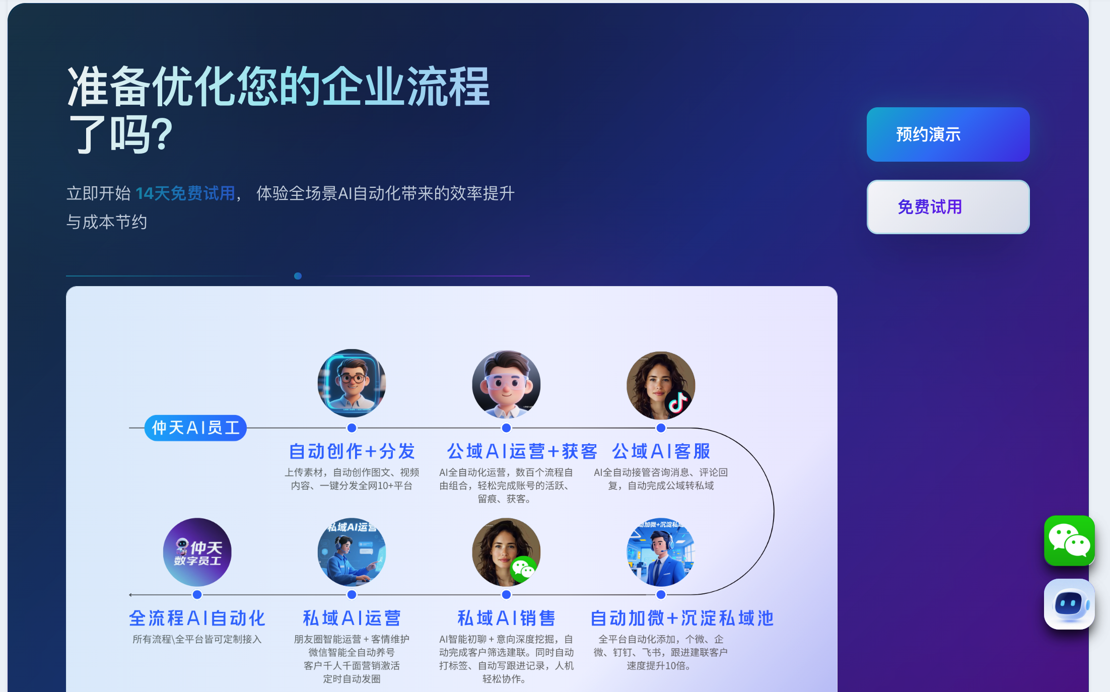 AutoAI企业全域营销 是广州仲天旗下,由不同系列AI数字员工 + 数百个自动化 驱动的智能化业务平台,提供AI自动化在 公域运营获客 到 私域运营销售的 全自动化流程。