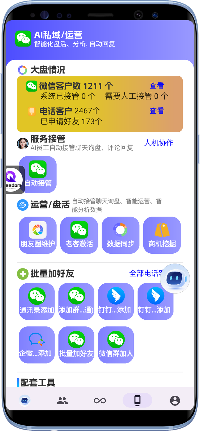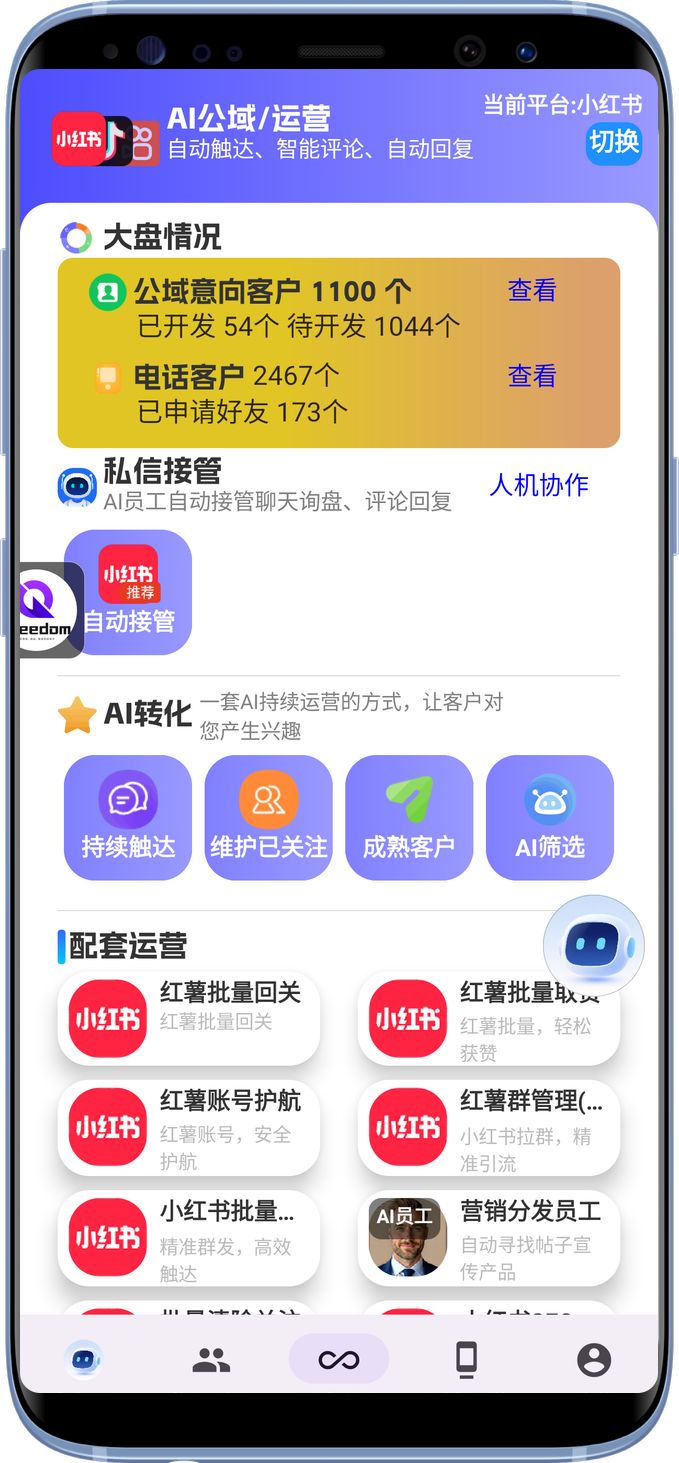 - 在私域中,自动添加好友,自动跟进介绍产品,筛选出有意向的客户后,交由人工接管。