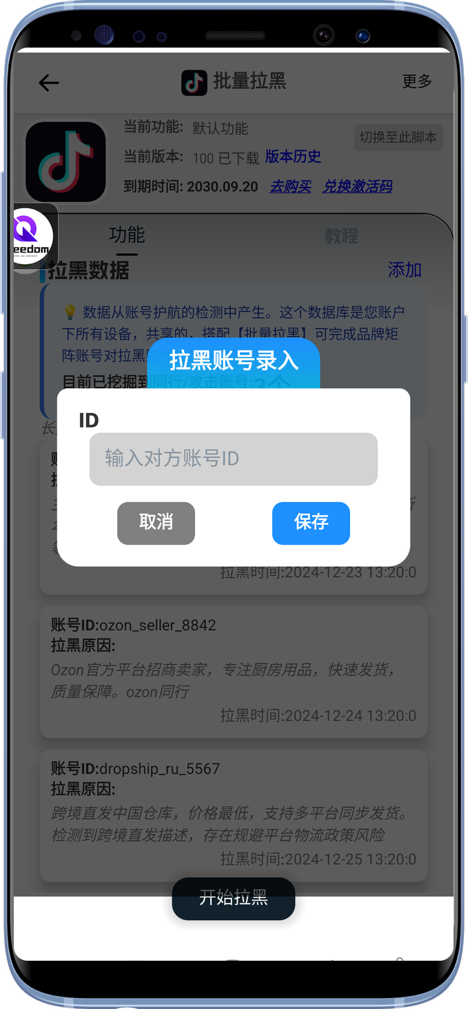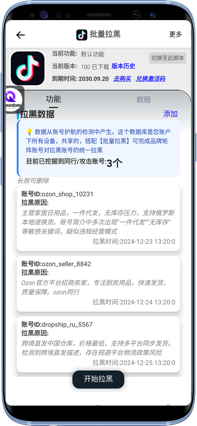搭配【批量拉黑】,实现多设备拉黑数据共享同步。也可手动录入自己发现的同行账号