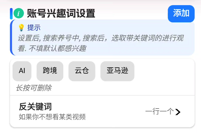 设置兴趣词,只刷主题带兴趣词的,确定账号推荐方向
