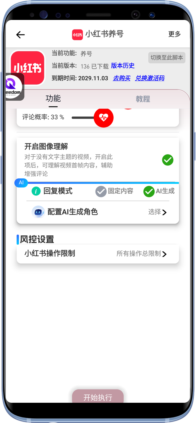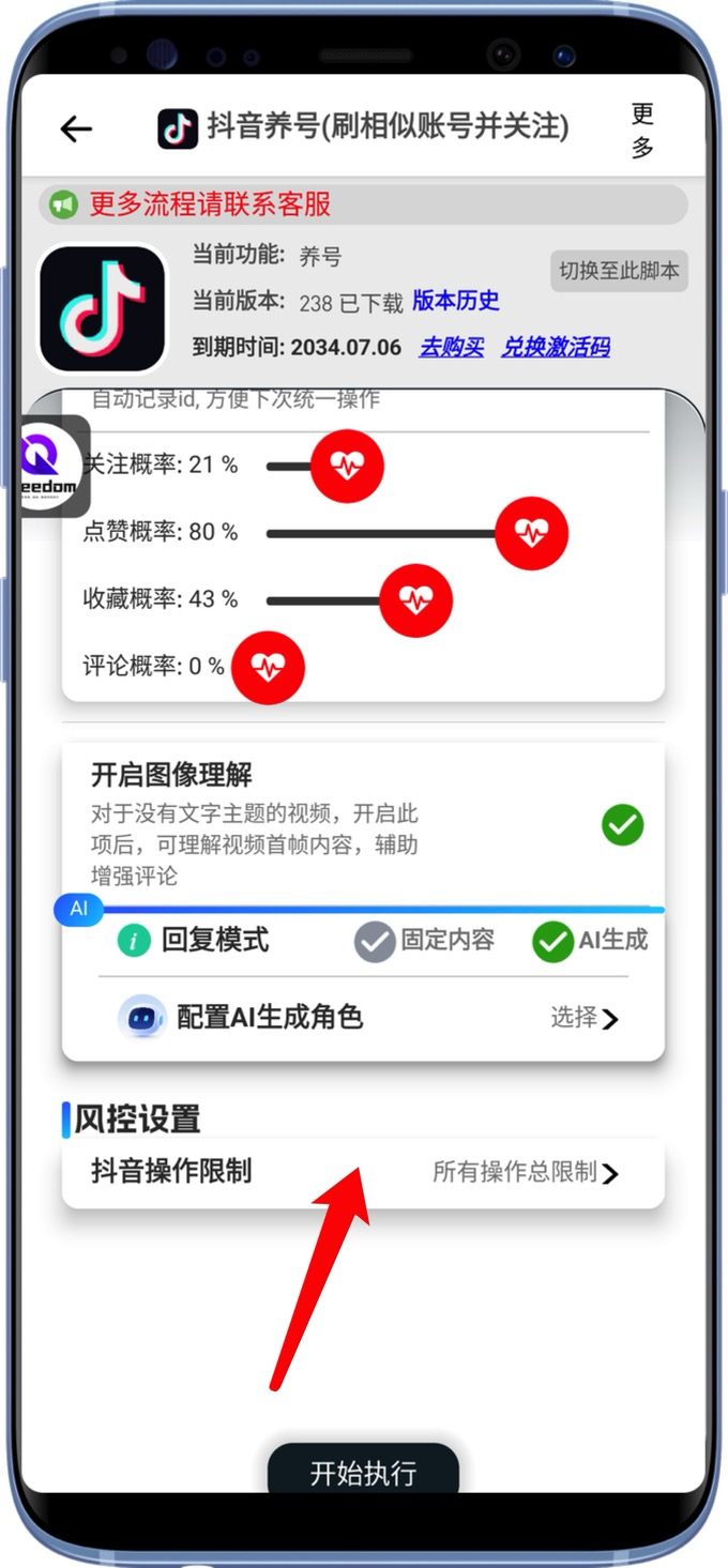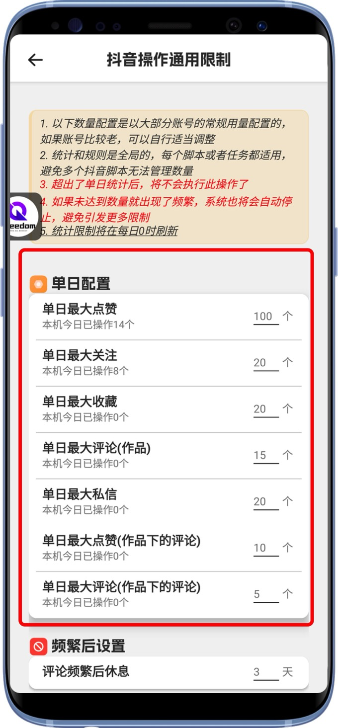 根据账号新老程度,设置适合的上限,避免无节制操作 这个“操作通用限制”是所有抖音系自动化任务通用的、同样的小红书也有。