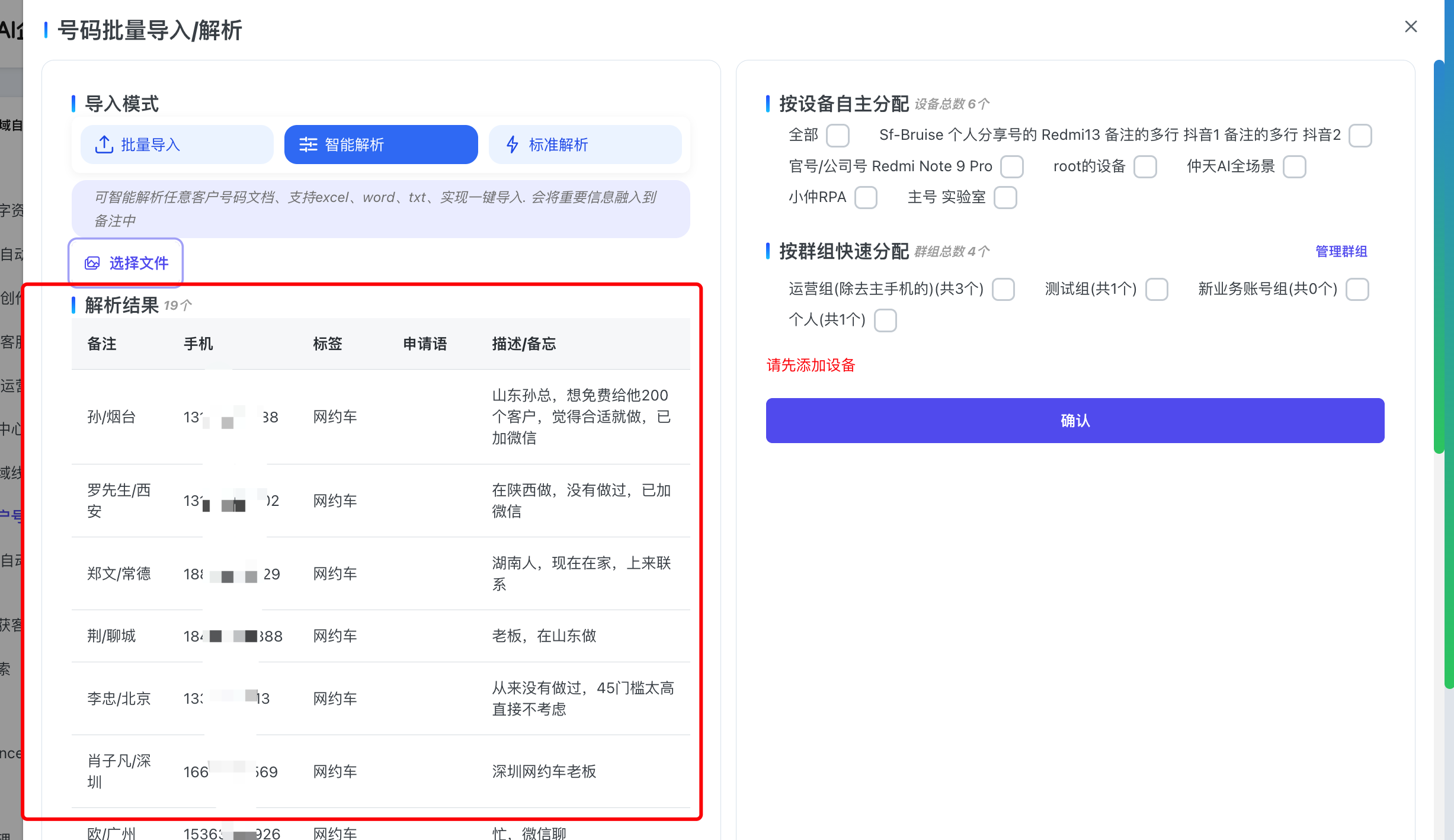 一份复杂客户名单文档,AI智能解析出 备注、描述备忘、标签! 并且智能开始添加!